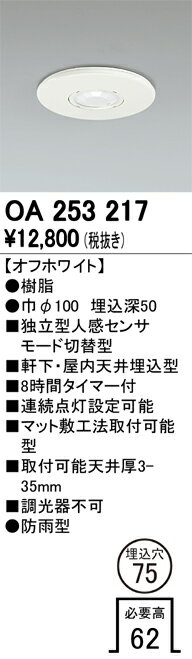 βオーデリック/ODELIC エクステリア【OA253217】人感センサ モード切替型(天井面埋込用) 屋外用独立型センサ オフホワイト 防雨型