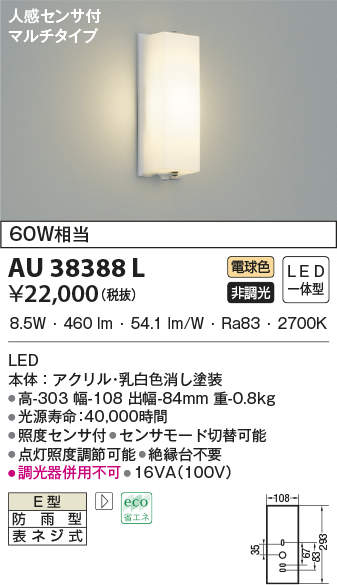 AU38388Lエクステリア LED一体型 勝手口灯人感センサー付マルチタイプ 非調光 電球色 防雨型 白熱球60W相当コイズミ照明 照明器具 門灯 屋外用 アウトドアライト